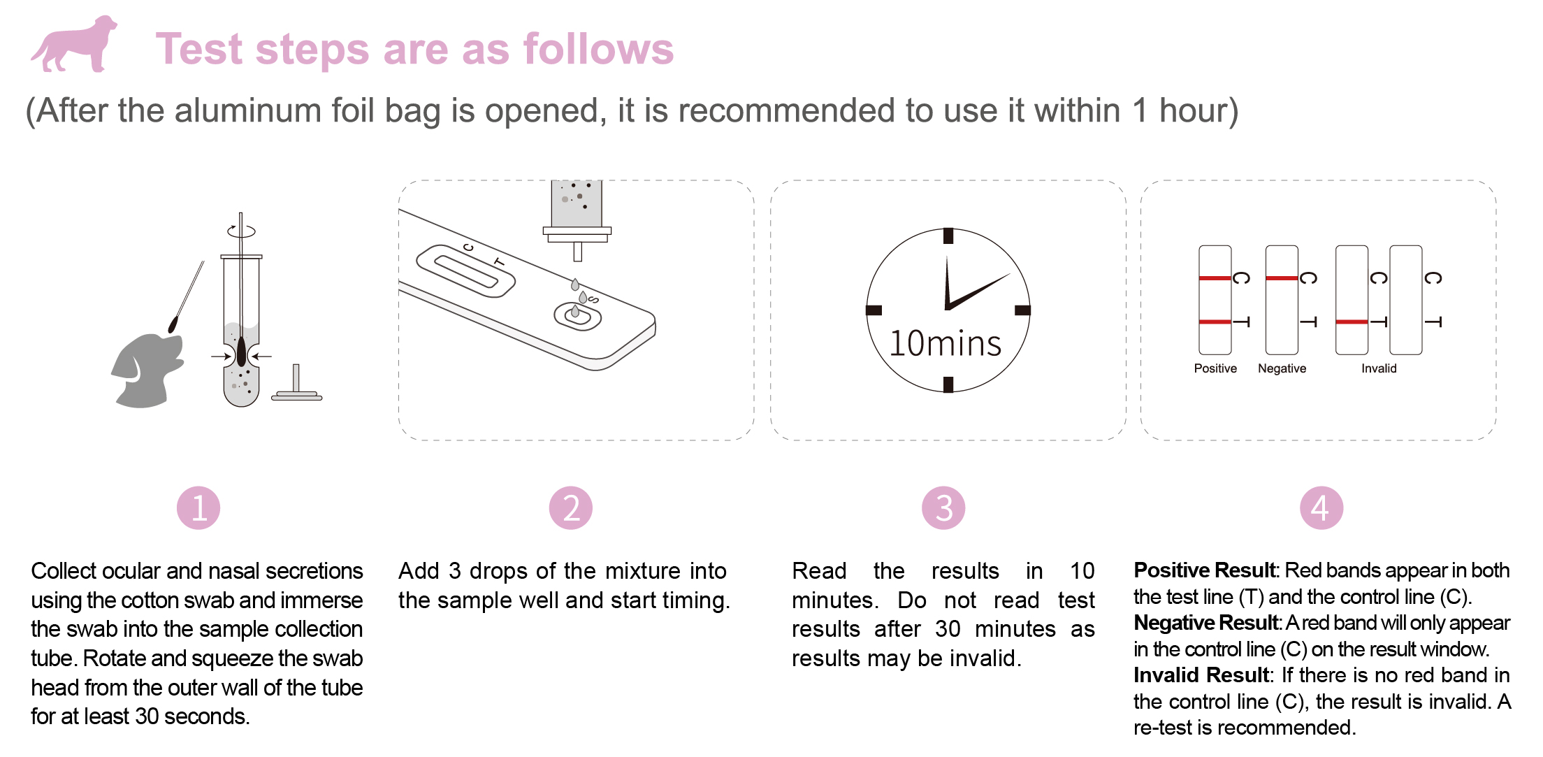 This product does not require any additional equipment and is used for in-vitro qualitative screening for Canine Distemper Virus (CDV) antigen in ocular and nasal secretions of dogs. This product is used for self-test.