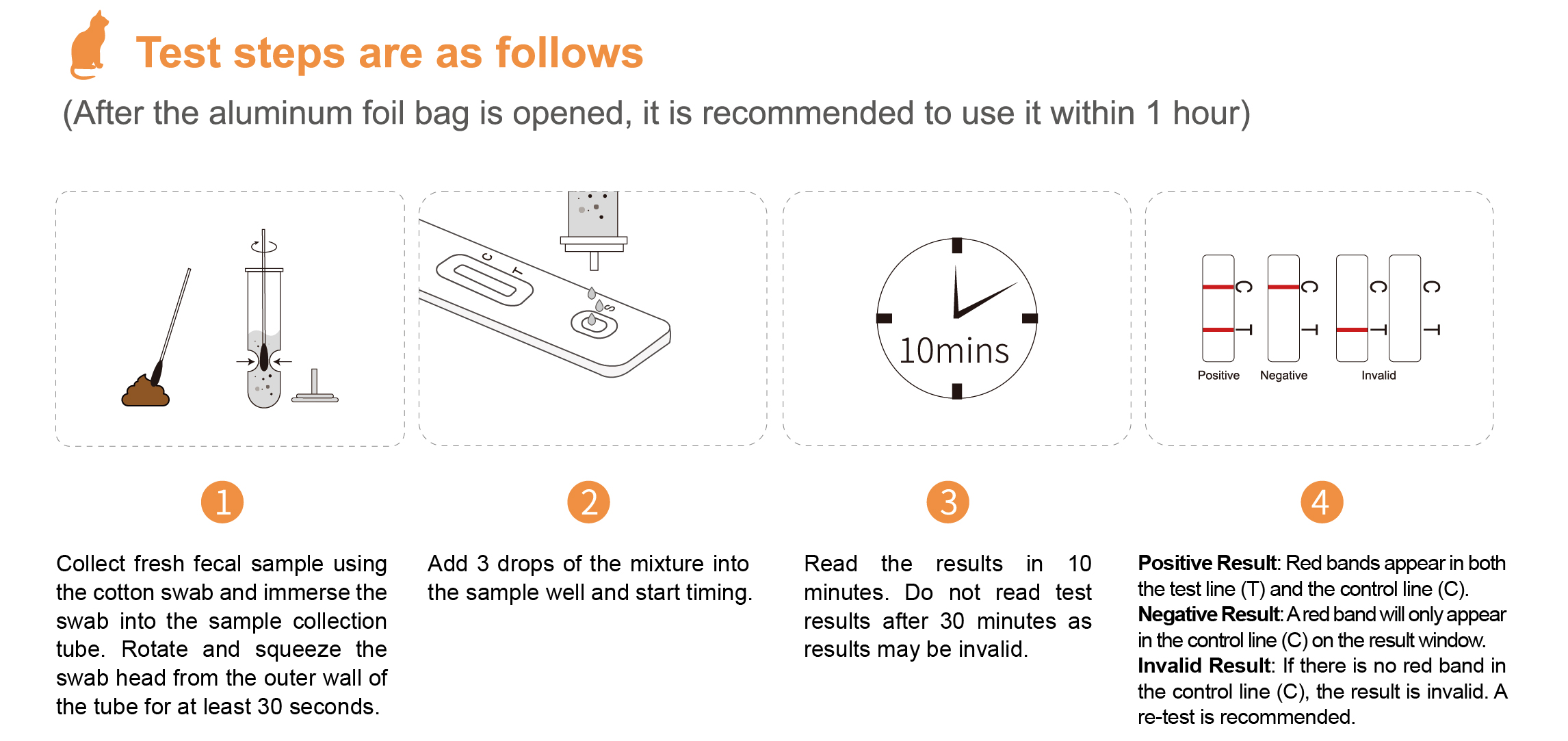 This product does not require any additional equipment and is used for in-vitro qualitative screening for Feline Panleukopenia virus (FPV) antigen in cat feces.This product is used for self-test.