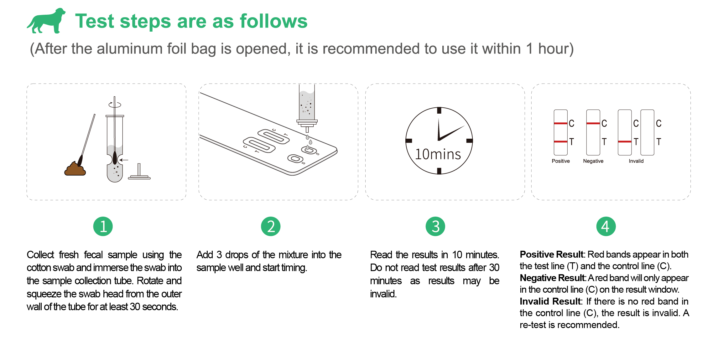 This product does not require any additional equipment and is used for in-vitro qualitative screening for Canine Parvovirus (CPV) and Canine Coronavirus (CCV) antigen in dog feces. Also this product can detect CPV-2, CPV-2a, CPV-2b, CPV-2c and CPV-1 strains.